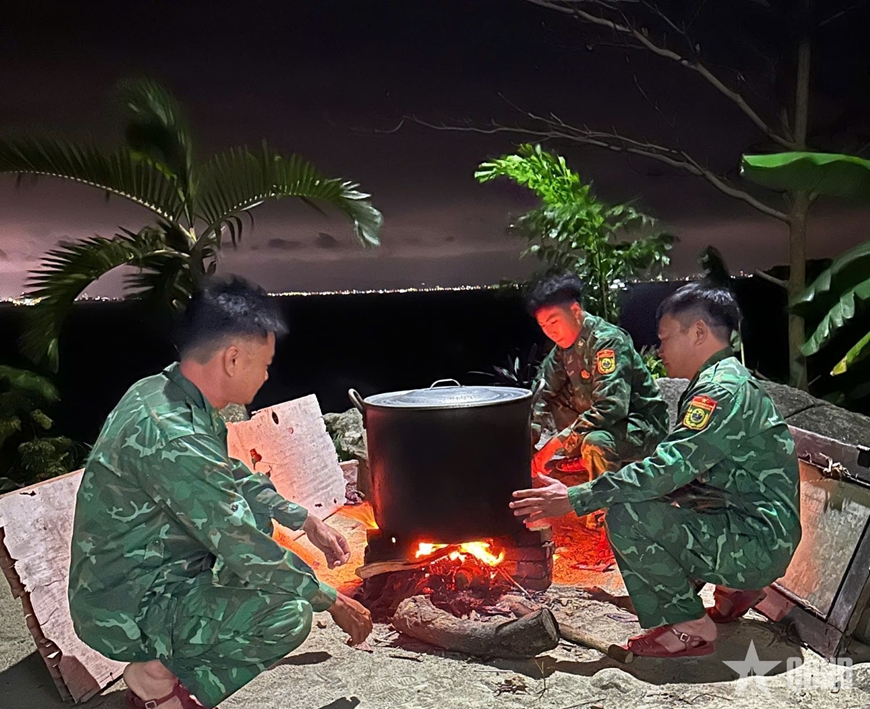 Cán bộ, chiến sĩ Trạm Kiểm soát Biên phòng Hòn Sơn Chà nấu bánh chưng đón Tết Bính Ngọ.