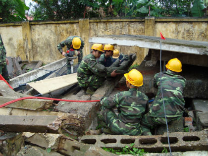 | Cán bộ, chiến sĩ Tiểu đoàn 93 luyện tập cứu hộ cứu nạn tại công trình sập đổ. Ảnh: Minh Tuấn. |