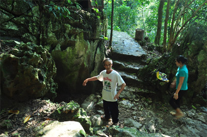 | Ông Nông Văn Chu "hướng dẫn viên tình nguyện" trong Khu di tích Pác Bó. Ảnh: Đông Hà. |