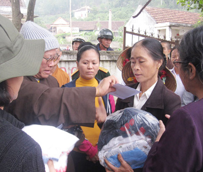 QĐND Online - “Hưởng ứng lời kêu gọi của Đảng, Nhà nước và được Phật dạy, chúng tôi vào đây cứu khổ, ban vui cho đồng bào bị ảnh hưởng bởi đợt lũ lụt vừa qua,” Thượng tọa Thích Thanh Phương, trụ trì chùa Sủi, Phú Thụy, Gia Lâm, Hà Nội nói với lãnh đạo và nhân dân vùng lũ miền Trung nơi đoàn của nhà chùa tới thăm.