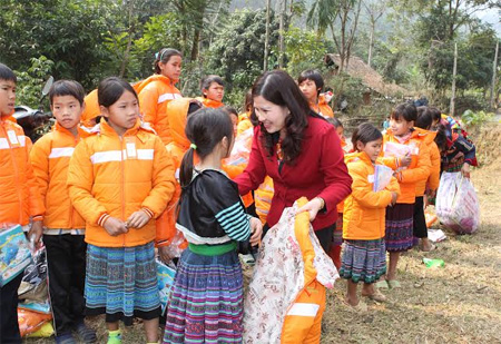 | Dược sĩ Lê Thị Bình – TGĐ Công ty Dược phẩm Tâm Bình tặng áo cho các trẻ em nghèo. |