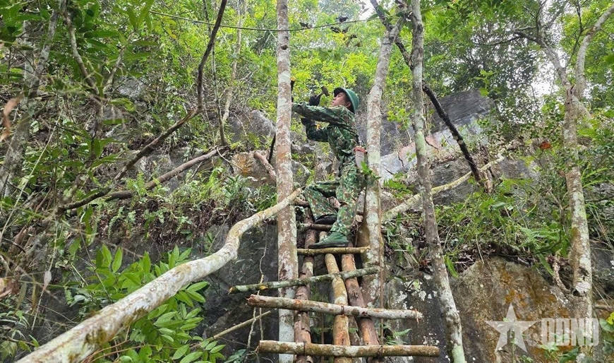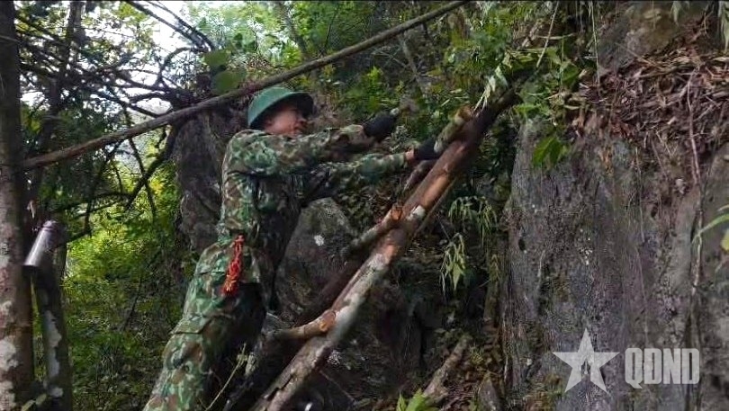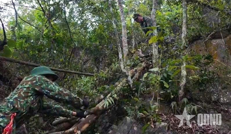 Ở những đoạn dốc đứng, việc đi bộ gần như không thể. Cán bộ, chiến sĩ phải chặt cây rừng, ghép thành thang tạm. Những thân gỗ còn nguyên mùi nhựa, buộc chặt bằng dây rừng, trở thành “cầu nối” qua các vách đá dựng đứng. Có đoạn, cả tổ phải buộc dây, lần lượt đu mình qua những mỏm đá cheo leo, phía dưới là vực sâu hun hút.