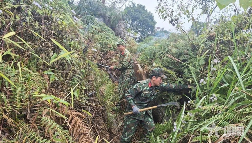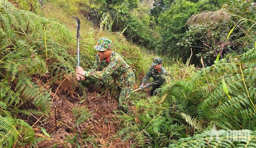Theo chân một tổ công tác trong buổi sáng sương phủ kín sườn núi, chúng tôi chứng kiến hành trình mở lối đầy gian nan. Tầm nhìn chỉ vài mét, mặt đất trơn trượt. Những người lính lặng lẽ đi trước, tay rựa, tay cuốc, vừa phát cây vừa dò đường.