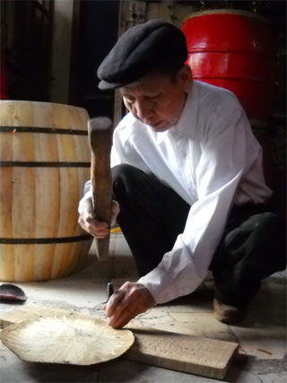 Nghệ nhân Phạm Chí Tịnh đang làm nhẵn tang trống để chuẩn bị căng mặt trống.