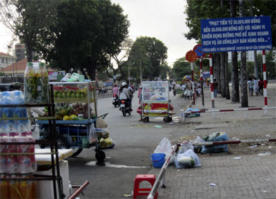Con đường vào chợ Thị Nghè ở Khu phố văn hóa 4, phường 19, quận Bình Thạnh, trên bức tường có tấm biển “Cấm tụ tập buôn bán ở đây”, thế là các tiểu thương không tụ tập buôn bán trên vỉa hè mà đổ dồn cả xuống lòng đường để... tiện buôn bán. Người dân qua lại khó khăn vì xe cứ ùn tắc liên tục. Mặt khác, chợ này nằm ngay chân cầu Thị Nghè nên rất dễ xảy ra tai nạn giao thông. Sau một thời gian chính quyền phường quản lý gắt gao, tại đây tình trạng lấn chiếm đã được hạn chế. Tưởng chừng đã vào quy củ nên phường nới rộng quản lý và treo tấm băng rôn tuyên truyền “Lòng đường và hè phố chỉ được sử dụng cho mục đích giao thông” thì hàng quán lại tràn xuống đường và người tham gia giao thông phải né. Anh Trần Văn Lành, buôn bán tại khu vực trên cho biết: “Khi có công an phường hay trật tự đô thị đến thì chúng tôi dẹp hàng quán ngay, sau đó lại đem ra. Buôn bán mà, nơi nào có khách thì bán chứ bây giờ vào sâu trong chợ mấy ai mua? Bị phạt, thu giữ phương tiện thì cũng đành chịu”.