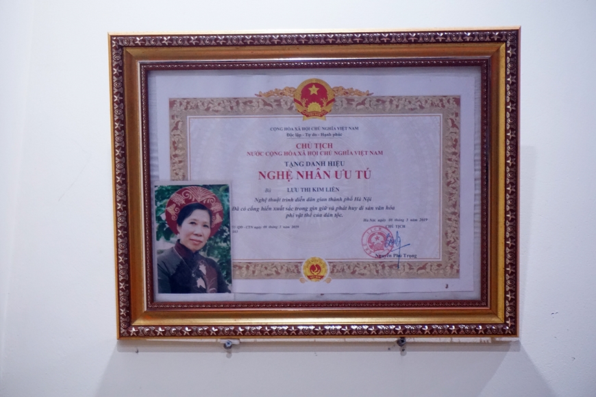 Đến với Nghệ nhân Ưu tú Lưu Thị Kim Liên vào một ngày thu, chúng tôi ấn tượng với căn nhà tràn ngập huân huy chương, các giải thưởng của bà. Bức tường nhà trở thành không gian trưng bày, nơi đó, các huân huy chương và bằng khen, giải thưởng được xếp đặt trang trọng, như một biên niên sử huy hoàng đánh dấu suốt chặng đường cống hiến không mệt mỏi cho nghệ thuật ca trù.