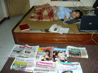 | Vũ Anh Tuấn đang say sưa viết báo. |