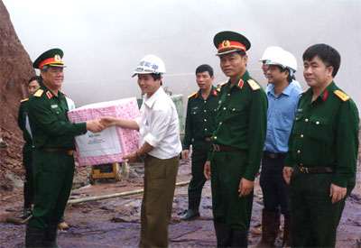 | Thượng tướng Nguyễn Khắc Nghiên kiểm tra công trình và tặng quà cán bộ, công nhân tham gia xây dựng đường tuần tra biên giới tại tỉnh Lạng Sơn. Ảnh: Hữu Bình. |