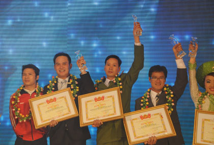 | Và vinh dự là một trong 10 gương mặt trẻ tiêu biểu được Trung ương Đoàn vinh danh năm 2009. Thượng uý Trần Ngọc Toản đứng giữa. |