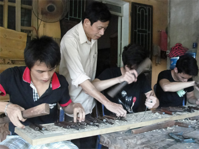 | Ông Phạm Năng Thuận truyền nghề cho các thợ trẻ. |