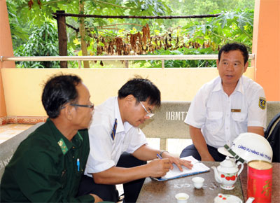 Cán bộ Cảng vụ hàng hải TP Hồ Chí Minh và Đồn biên phòng Long Hòa trao đổi thông tin, điều tra vụ tai nạn. Ảnh: Xuân Cường.