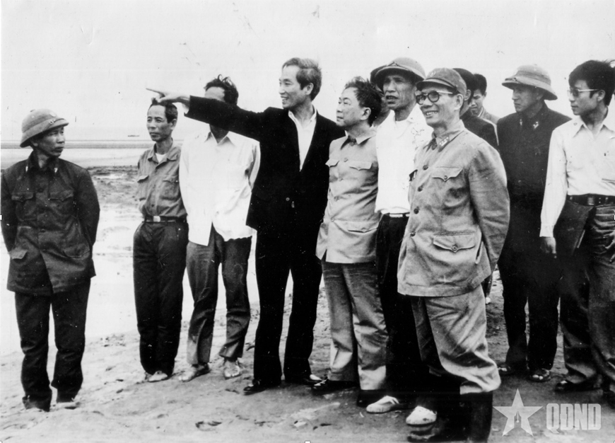 | Đồng chí Đoàn Duy Thành (người mặc đồ sẫm màu, chỉ tay) giới thiệu với Phó thủ tướng Thường trực Tố Hữu về chiến lược lấn biển tại Hải Phòng năm 1979. Ảnh tư liệu |