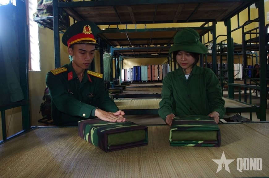 Đại úy Đoàn Thanh Túc, Phó đại đội trưởng Đại đội 5 hướng dẫn sinh viên gấp nội vụ.