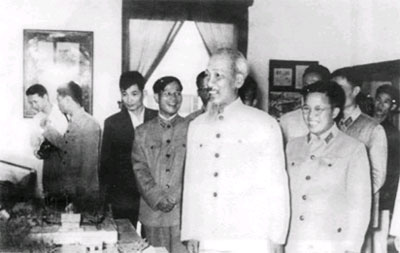 | Chủ tịch Hồ Chí Minh với đồng chí Lê Quang Đạo (bên phải) thăm Bảo tàng Quân đội (năm 1958). Ảnh tư liệu. |