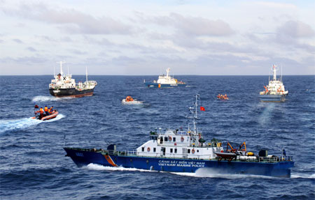 | Biên đội tàu Vùng CSB3 trấn áp bọn cướp biển chiếm giữ tàu Zafirah (X) quốc tịch Ma-lai-xi-a. Ảnh: Xuân Định. |
