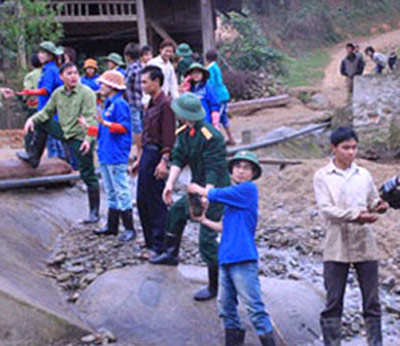 Màu áo lính cùng với màu áo tình nguyện của các tri thức trẻ hòa với sắc phục lộng lẫy của đồng bào Thái trên khắp các thôn bản, tạo nên khí thế hăng say lao động miệt mài. Công việc phát quang đường làng, ngõ xóm, tuyên truyền, dọn dẹp vệ sinh, khơi thông cống rãnh quanh bản được ưu tiên triển khai làm đầu tiên. Ở Tằng Phăn, 100% người dân là đồng bào Thái nên đã quen với phong tục chăn nuôi gia súc, gia cầm thả rông. Trong những ngôi nhà sàn, người ở sàn trên, trâu, bò, lợn gà nhốt ở sàn dưới rất mất vệ sinh. Mùi ô uế nồng nặc bốc lên khắp nơi trong bản. Đây chính là mảnh đất màu mỡ để các loại vi trùng, vi khuẩn và các loại bệnh truyền nhiễm phát triển. Vừa lao động, các đoàn viên thanh niên và tri thức trẻ tình nguyện của Đoàn KT-QP 4 vừa tổ chức tuyên truyền bằng mô hình trực quan. Đoàn viên Nguyễn Thị Hằng, tri thức trẻ tình nguyện của Đoàn KT-QP 4 tranh thủ thời gian đã hướng dẫn cho chị em phụ nữ trong bản thực hiện nếp sống vệ sinh khoa học như: vệ sinh cá nhân, nằm ngủ phải mắc màn, ốm đau phải dùng thuốc chữa bệnh chứ không được cúng con ma… Cứ thế, chỉ trong buổi sáng, đường to, ngách nhỏ ở bản Tằng Phăn đã khoác trên mình tấm áo mới, quang đãng, sạch sẽ. Xa xa những chàng thanh niên lực lưỡng đang cật lực đào đất đắp sân bóng chuyền của bản. Công việc vất vả nhất trong hai ngày về với Tằng Phăn có lẽ là việc bốc đá ở suối khe lên đắp hai đầu mố của đập tràn. Sau cơn lũ năm trước hai đầu mố của đập tràn đã bị nước cuốn trôi để lại những hố sâu hoắm, những mỏm đá không còn lớp xi măng hàn gắn nên nhe răng như thách thức. Gần một buổi đánh vật với những viên đá lớn nhỏ, hai mố đập tràn đã được vá lại lành lặn, giúp cho người dân đi lại thuận lợi.