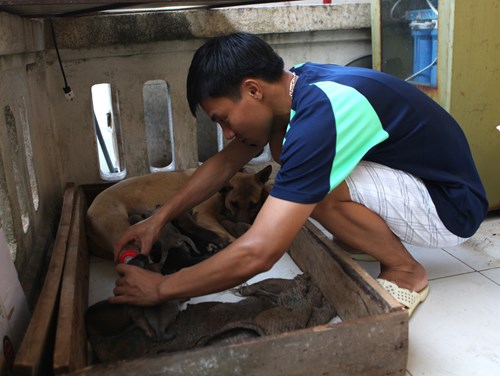 Chiến sĩ quân y, đảo Trường Sa Lớn chăm sóc những chú chó con vừa mới sinh nở. |