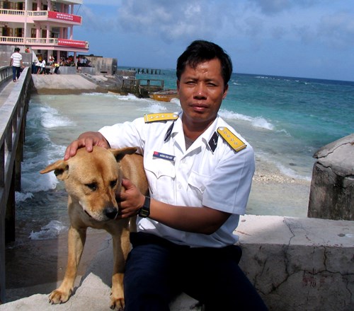 Chú chó đầu đàn trên Điểm A, đảo Đá Tây luôn gần gũi với cán bộ trên đảo. |