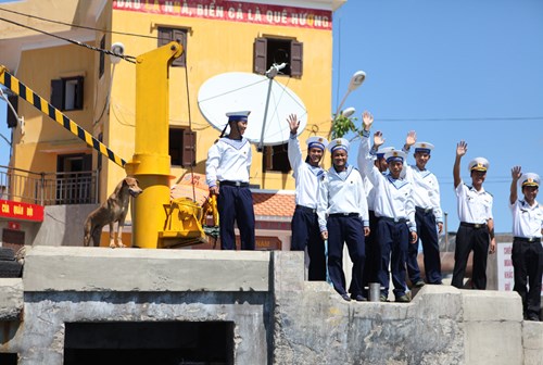 Chú chó trên Điểm C, đảo Đá Tây cùng cán bộ, chiến sĩ vẫy chào tạm biệt đoàn công tác ra thăm đảo. |
