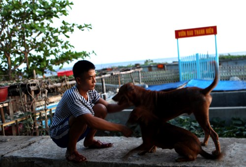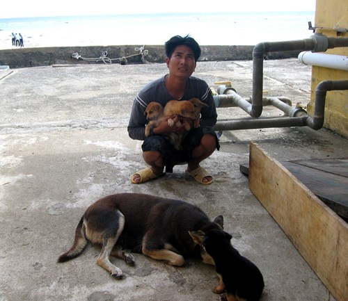 Chiến sĩ điểm A, đảo Thuyền Chài đùa vui với các chú chó trên đảo. |