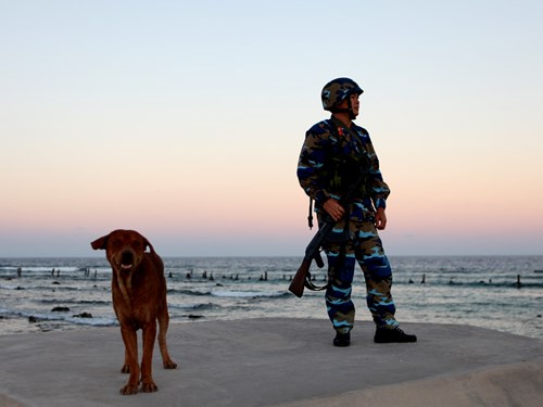 Chó Bin đầu đàn đi canh gác bảo vệ đảo cùng chiến sĩ đảo Trường Sa Đông. |