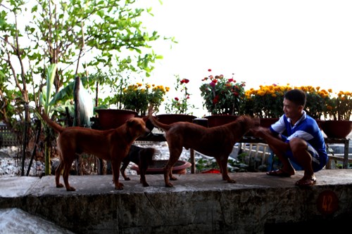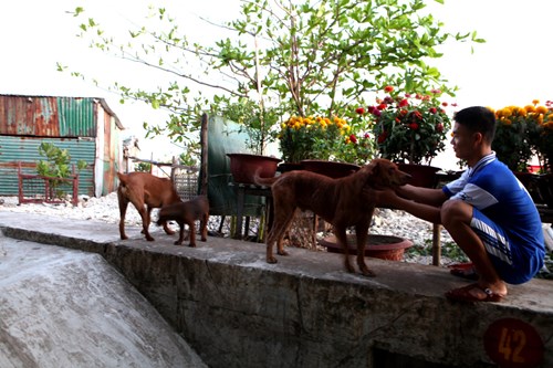 Khách đến thăm Điểm A, đảo Thuyền Chài đùa giỡn với các chú chó trên đảo. |