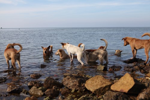 Các chú chó trên Điểm A, đảo Thuyền Chài đi săn bắt cá dưới biển. |