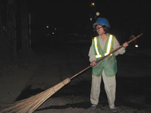 18 giờ hàng ngày cũng là lúc công việc của các chị bắt đầu. Trước tiên phải thu dọn rác mô (rác đổ thành đống trên mặt đường); đẩy xe, gõ kẻng báo hiệu cho dân phố ra đổ rác, rồi tua vỉa, moi cống hàm ếch và nhổ cỏ gốc cây; sau đó tiếp tục dùng chổi loại 1,2m quét lá rụng, làm sạch mặt đường… cho đến khi đường không còn bất cứ một loại rác thải nào. Thời gian lên xe trở về tổ ấm của mình thường là 2 đến 3 giờ sáng. Có những hôm mưa lớn, đường lầy lội, ô tô chở rác về chậm thì 4 hay 5 giờ sáng mới xong ca cũng là chuyện thường ngày đối với chị em.