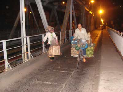 | Ì ạch chở hàng qua cầu Long Biên. |