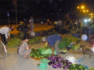 Không khí tất bật và vội vã là cảm nhận của chúng tôi vào lúc 0 giờ. Vội vàng từ giấc ngủ, đến những dáng đi tất tả. Chợ mỗi lúc một đông, ai ai cũng hối hả với những gánh hàng còn tươi nguyên, nhanh chân tìm vị trí thích hợp đổ hàng xuống bán. Chốc chốc lại có người đội trên vai những bao tải lớn rau củ vội vàng chuyển giao cho khách quen.