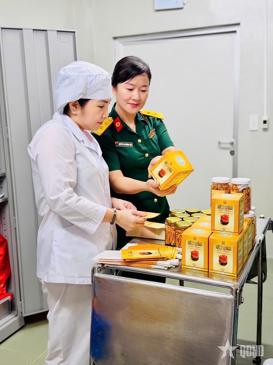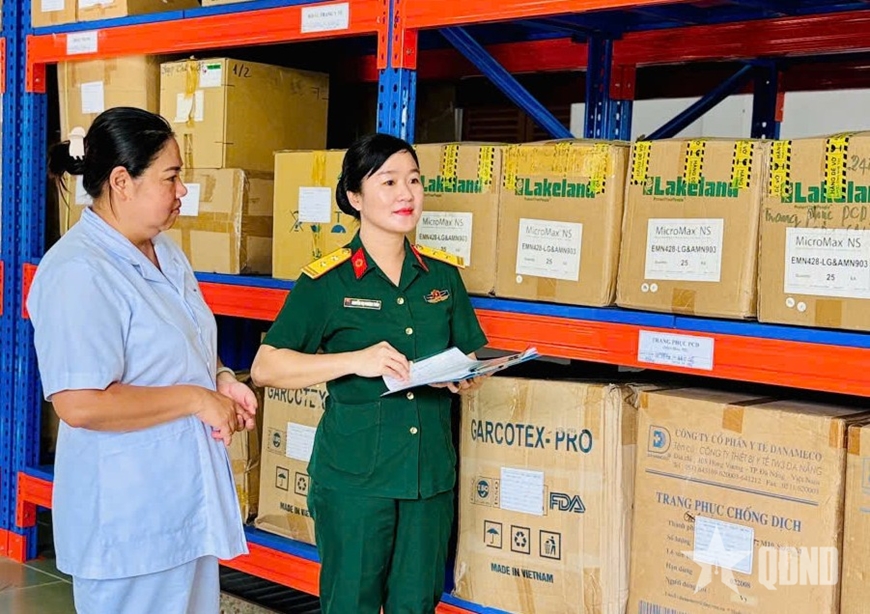 Trung tá Nguyễn Thị Phương Thảo (bên phải) kiểm tra công tác bảo quản dược phẩm, vật tư y tế. |