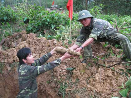 Chúng tôi theo chân các anh tới khu vực bản La Trọng 2, nơi đơn vị đang rà phá bom, mìn. Tới nơi, các anh nhanh chóng tiến hành công việc đã được phân công. Người thì phát quang cây cối, căng dây làm dải phân cách (mỗi dải rộng 1m, dài từ 20-25m), một số khác lại cắm cờ, cắm biển báo nguy hiểm. Sau đó họ cầm máy dò mìn nhẹ nhàng tiến về phía trước. Chiếc máy dò đang kêu rè rè bỗng đột ngột thay đổi tín hiệu, kêu “tít…tít…tít” báo hiệu dưới lòng đất có kim khí. Thượng uý Hùng bình tĩnh bước tới xem xét tình hình, quan sát hiện trường rồi chỉ huy cho hai chiến sĩ mang cuốc, xẻng lại đào. Đây là một vị trí ẩm ướt, gần một rãnh nước nhỏ chảy qua nên khi đào đất các anh hết sức nhẹ nhàng và cẩn thận. Gần một giờ đồng hồ, chiếc hố được đào đã sâu ngang cổ người và rộng chừng 4m2. Theo lệnh của đội trưởng, một chiến sĩ cầm chiếc thuốn bằng sắt nhọn dài khoảng 0,5m nhẹ nhàng lội xuống hố. Anh nhẹ nhàng dùng tay bốc từng nắm bùn đất nhão nhoẹt lên và thăm tìm vị trí của vật liệu nổ. Sau hơn 10 phút, anh cũng đã chạm được vào vật kim loại còn nằm ở độ sâu khoảng 20cm nữa. Viên đạn được đưa lên nặng khoảng 5kg, dài khoảng 40cm thân vẫn còn nguyên vẹn nhưng đầu đạn đã bị hoen rỉ. Thượng uý Hùng cho biết: “Đây là một quả đạn pháo cao xạ 85mm và quả đạn vẫn có khả năng phát nổ khi bị va chạm mạnh”. Cũng trong buổi sáng đó, các chiến sĩ trong đội đã đào phá thành công hàng chục quả bom bi và nhiều đầu đạn các loại…