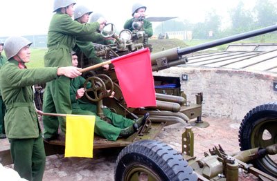 Tại trận địa của Đại đội 8 (Tiểu đoàn 3), tiếng kẻng báo động dồn dập vang lên, không khí “thời chiến” xua tan làn mưa xuân lất phất. Dứt tiếng kẻng, những bước chân chiến sĩ dồn dập hướng về phía trận địa. Họ vơ vội những chiếc mũ sắt, đặc trưng của lính pháo phòng không và mau lẹ vào vị trí chiến đấu…