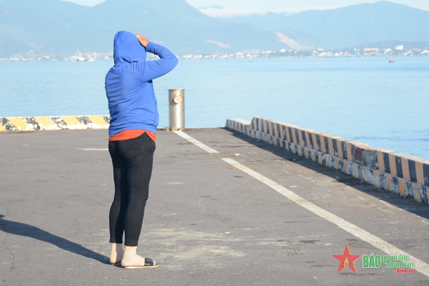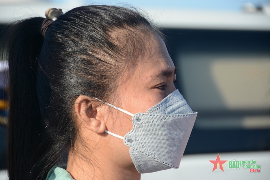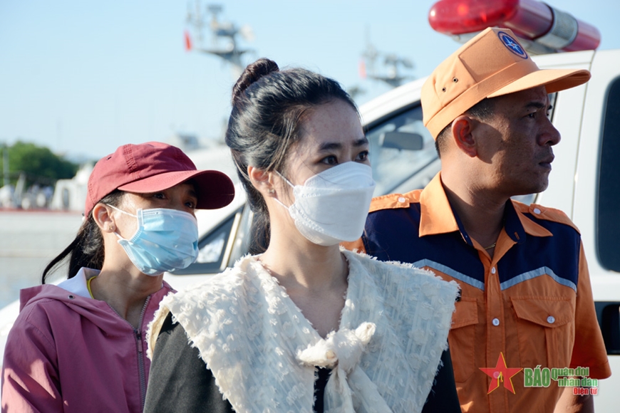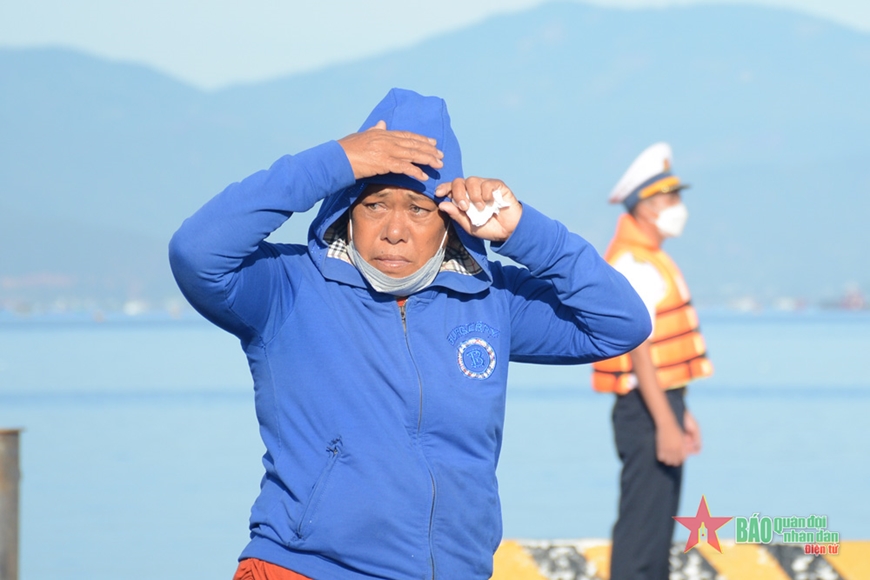 5 người phụ nữ, đại diện cho 5 gia đình đi cùng Bộ đội Biên phòng tỉnh Bình Thuận đến đón chồng, cha mình tại cảng Cam Ranh đều chung cảm xúc vui mừng xen lẫn lo lắng khi người thân thoát nạn trở về. Đôi mắt rưng rưng, chị Đàm Thị Ngọc Hiệp, vợ của anh Lê Văn Dũng chia sẻ: “Cũng mừng, thấy thương sót cho anh, mười mấy ngày không ăn, chân tay đau, đi không nổi. Con tôi hỏi sao mẹ không cho đi thăm ba, tôi nói mai ba về rồi”.