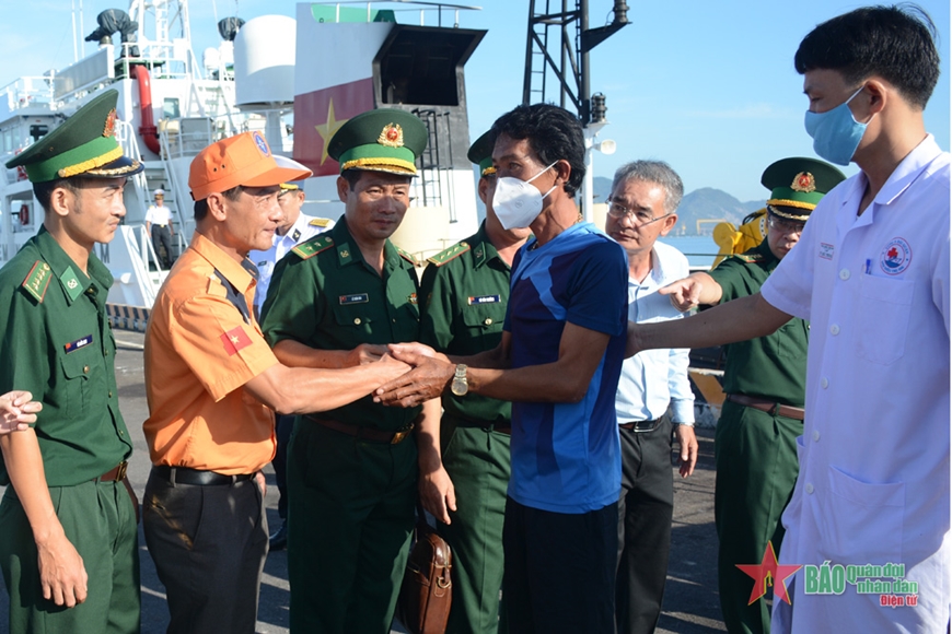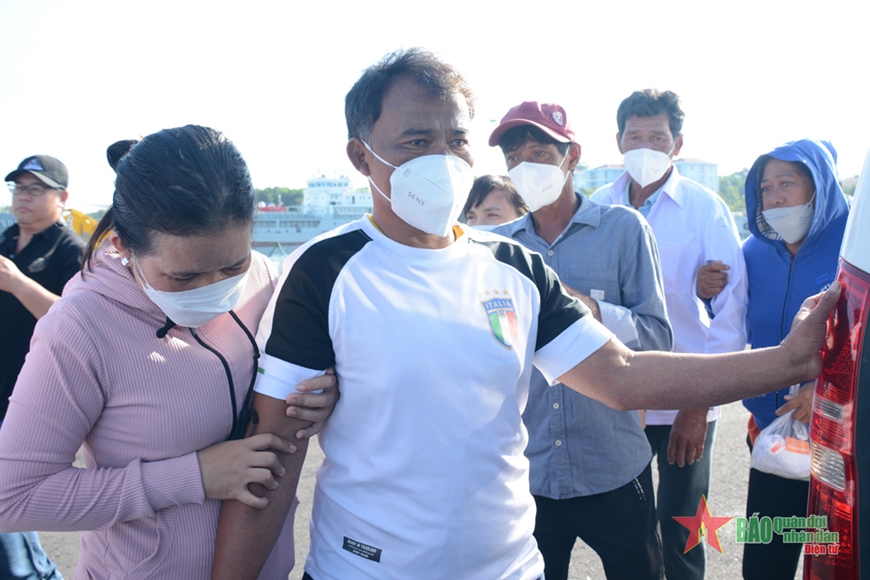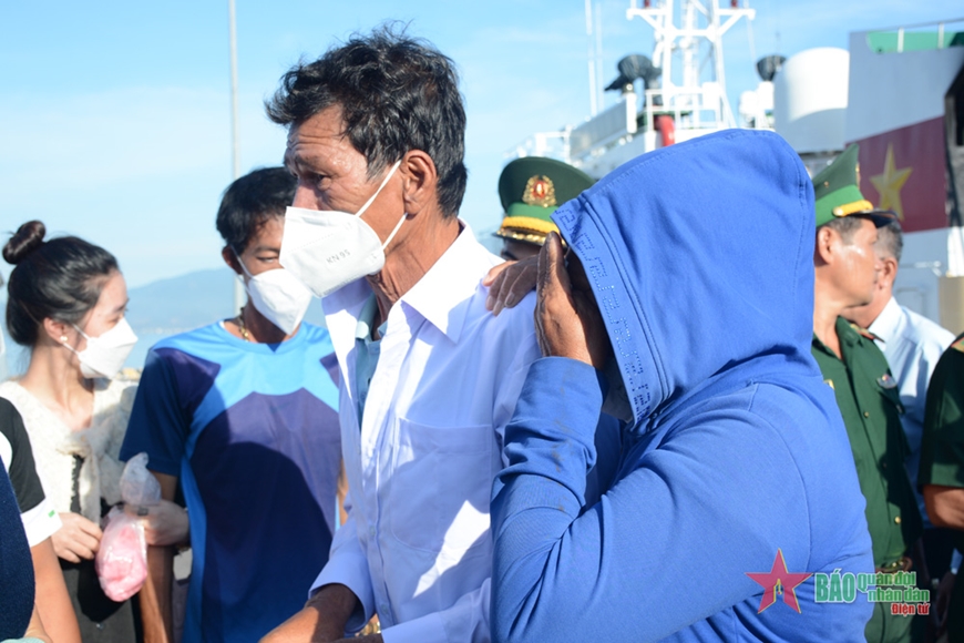 Vừa xuống tàu, chị Lê Thị Thanh Trang, vợ anh Bùi Văn Vinh đã chạy ngay đến ôm chặt lấy chồng, chị chỉ khóc mà không nói nên lời. Anh Vinh liên tục lấy tay gạt nước mắt, trấn an vợ. Còn chị Nguyễn Thị Hồng Vân, vợ anh Nguyễn Thành La, xúc động nghẹn lời khi gặp lại chồng trên bến cảng. Chị cảm ơn các lực lượng chức năng đã đưa người chồng tưởng đã chết về lại với gia đình.