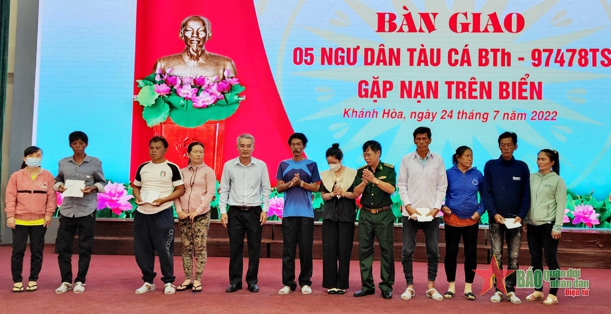 Sáng 24-7, tại cầu cảng Cam Ranh (Khánh Hòa) các lực lượng chức năng đã tiến hành bàn giao cho gia đình và địa phương 5 ngư dân may mắn sống sót trong vụ tàu BTh 97478 TS gặp nạn trên biển. Trong đó, 4 ngư dân trú tại TP Phan Thiết, tỉnh Bình Thuận, gồm: Bùi Văn Toàn, Nguyễn Văn Mỹ, Lê Văn Dũng, Nguyễn Thành La và Bùi Văn Vinh trú tại huyện Cái Nước, tỉnh Cà Mau. Như vậy, đến nay đã có 9/15 ngư dân gặp nạn được cứu sống, đưa về đất liền, 6 ngư dân còn lại đã chết do quá sức chịu đựng.