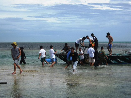 | Cán bộ, chiến sĩ đảo An Bang kéo thuyền chuyển tải vào đảo. Ảnh: Phúc Thắng. |