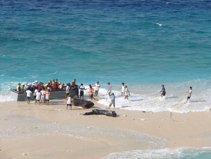 Đứng trên mặt boong, thấy đảo chỉ cách tàu chừng 1/2 hải lý, thế nhưng vì thủy triều xuống, thềm san hô nhô lên, xuồng không thể vào được.