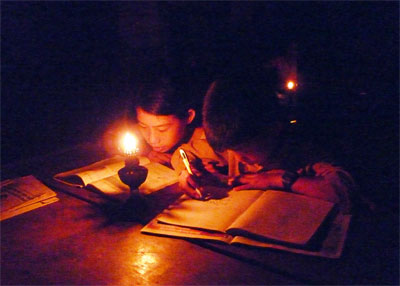 Các em nhỏ học bài dưới ánh đèn dầu leo lét.