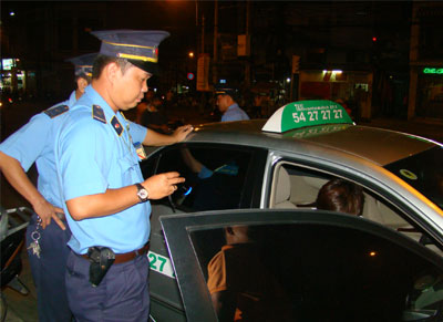 Lực lượng Thanh tra giao thông TP Hồ Chí Minh kiểm tra, xử phạt tài xế xe tắc-xi "chặt, chém" du khách ở trung tâm quận 1.