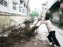 19h ngày 25-10, chúng tôi có mặt tại một trong những "điểm đen" về rác thải gây bức xúc trong nhân dân tại ngõ 325 Kim Ngưu. Lúc này rác sinh hoạt đã được các công nhân Xí nghiệp Môi trường đô thị số 3 thu gom trên hơn 10 xe chuẩn bị đem đi bốc lên xe tải lớn. Cạnh khối lượng rác cao như núi đó là một đống phế thải xây dựng lớn gồm đất và gạch vữa vụn nằm dài khoảng hơn 20m lấn cả lối đi chung. Theo chị Hoàng Kim Dung, Tổ 11 Xí nghiệp MTĐT số 3: "Sau khi thu gom hết rác thải sinh hoạt trên địa bàn phường Thanh Lương đến khoảng 12h đêm hơn 20 cán bộ của tổ mới có thể tập trung thu gom đống phế thải trên được. Việc thu gom này cũng phải mất ít nhất là 2 - 3 tiếng vì phế thải xây dựng có khối lượng lớn hơn nhiều rác thải sinh hoạt". Bức xúc về tệ đổ trộm phế thải xây dựng tại đây, các công nhân Tổ 11 cho biết họ cần sự vào cuộc ủng hộ của chính quyền địa phương một cách quyết liệt hơn nữa. Chị Trần Thị Hoa công nhân Tổ 11 cho biết: "Chúng tôi chỉ làm nghề phục vụ nên không có chức năng xử phạt những người vô ý thức đổ rác thải ra đường dù bắt gặp họ đang làm hành động đó". Như trong chiều ngày 22-10 vừa qua, bức xúc vì những hành vi ngang nhiên đổ trộm phế thải, chị Dung đã cương quyết dùng xích sắt "tạm giữ" một chiếc xe cải tiến đổ trộm phế thải. Vụ việc cũng được chị báo cáo CA phường Thanh Lương cách đó vài trăm mét nhưng cũng như mọi lần khác… CA phường không mấy khi bận tâm đến những vụ việc này. Trước đó, từ cuối năm 2008 không ít lần chị tổ trưởng này đã phải tạm giữ xe cải tiến đổ trộm phế thải theo cách như vậy và có báo cáo đầy đủ cho lực lượng CA. Có những lần đối tượng kiên quyết chống trả, không biết làm cách nào chị Dung nhấc máy gọi cho anh Bùi Quốc Tuấn, công an quản lý khu vực chị đang ở đến trợ giúp. Mặc dù không phải địa bàn mình quản lý nhưng khi có sự xuất hiện của công an, các đối tượng đổ trộm phế thải này đều bớt hung hăng và ngoan ngoãn chấp hành hiệu lệnh đưa xe tang vật về CA phường.