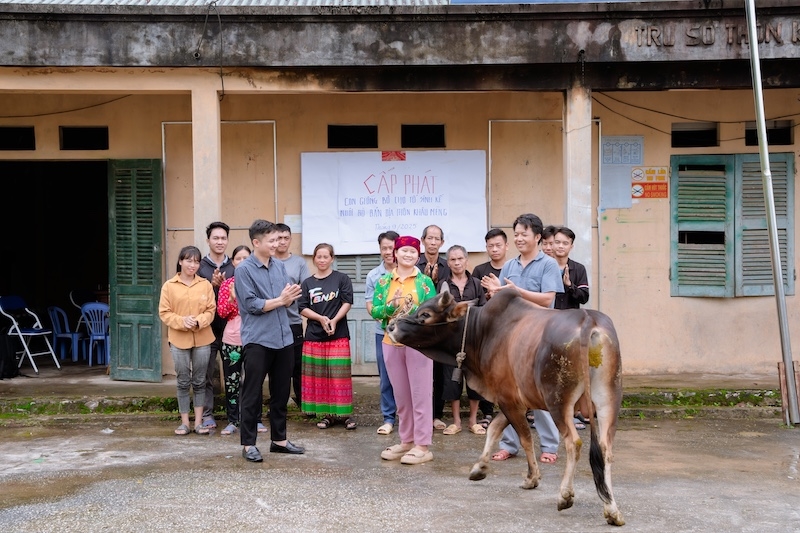 | Cấp phát bò con giống cho tổ sinh kế nuôi bò bản địa thôn Khâu Mèng. Ảnh: Trung tâm Nghiên cứu Sáng kiến và Phát triển cộng đồng |