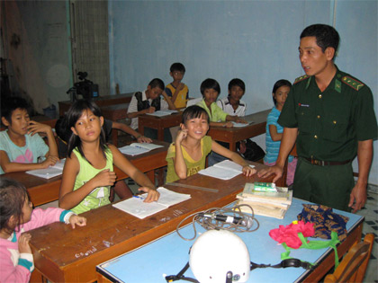 QĐND - Gần 8 năm nay, nhiều em học sinh nghèo và nhân dân phường Vĩnh Phước (thành phố Nha Trang) rất biết ơn người thầy giáo mang quân hàm xanh-Trung úy Nguyễn Văn Tưởng, Đồn Biên phòng Cầu Bóng (Bộ chỉ huy Bộ đội Biên phòng Khánh Hòa). Anh không những là người mang cái chữ đến với trẻ em nghèo, mà còn cảm hóa, giáo dục trẻ em bằng tình thương, trách nhiệm của một người lính…