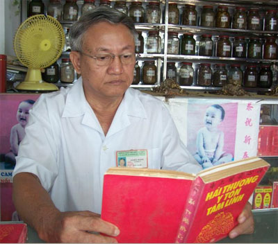 | Những lúc rảnh rỗi, ông Ngàn thường nghiên cứu đọc sách y học để nâng cao kiến thức chữa bệnh. |
