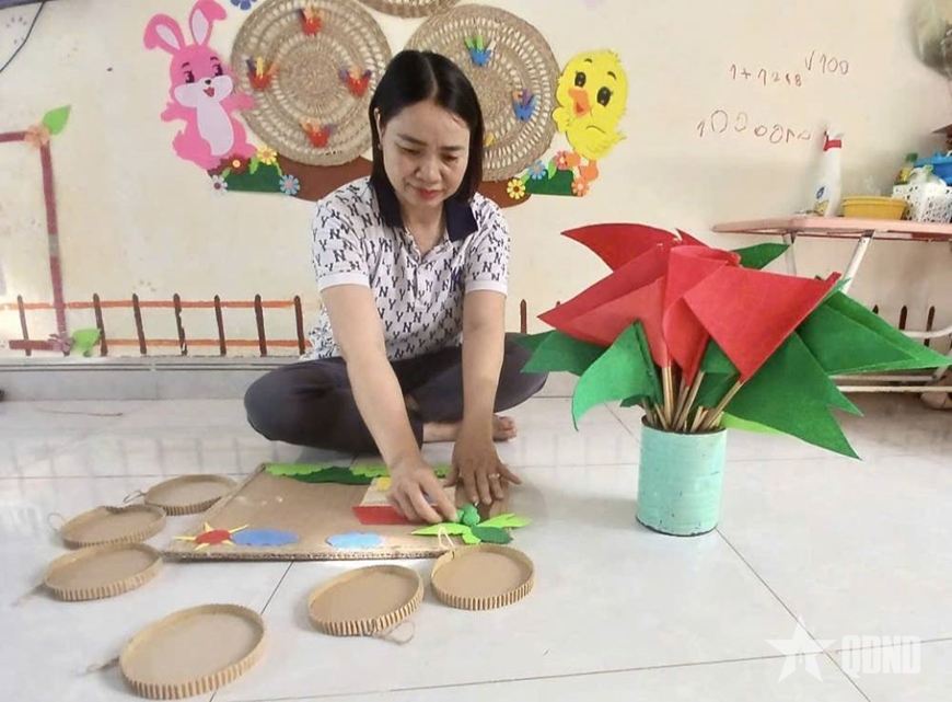 Tận tụy là thế, cô còn rất sáng tạo. Từ những vật liệu tưởng chừng bỏ đi như vỏ hộp sữa, chai nhựa, bìa carton, lá cây khô…, cô khéo léo biến chúng thành đồ dùng dạy học sinh động như mô hình ngôi nhà, con vật, đồ chơi âm nhạc. Những sản phẩm ấy không chỉ giúp tiết học thêm hấp dẫn mà còn dạy trẻ biết tiết kiệm, yêu lao động, bảo vệ môi trường.