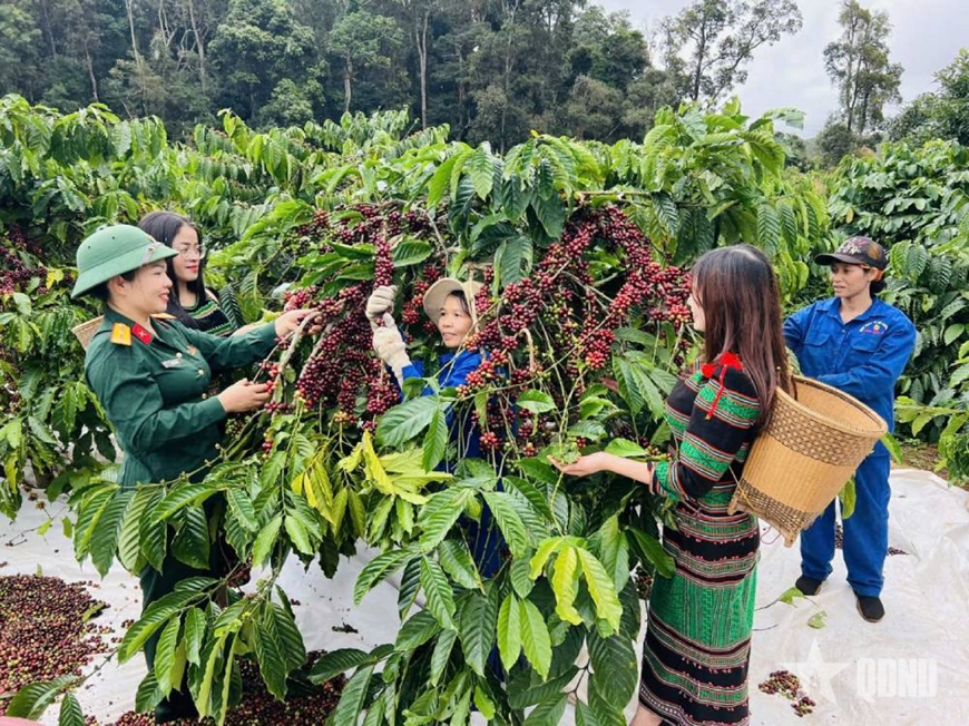 Thiếu tá QNCN Roãn Thị Ngọc Hảo cùng với chị em Hội phụ nữ đơn vị thu hoạch cà phê.