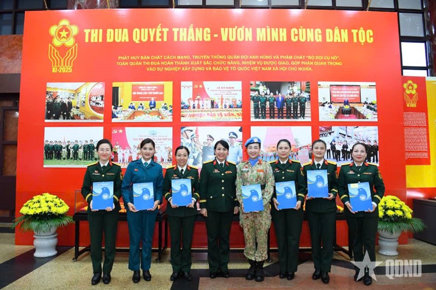 Thiếu tá QNCN Roãn Thị Ngọc Hảo (ngoài cùng bên phải) nhận quà của Ban Phụ nữ Quân đội và chụp hình lưu niệm với các đại biểu dự Đại hội Thi đua Quyết thắng toàn quân lần thứ XI.