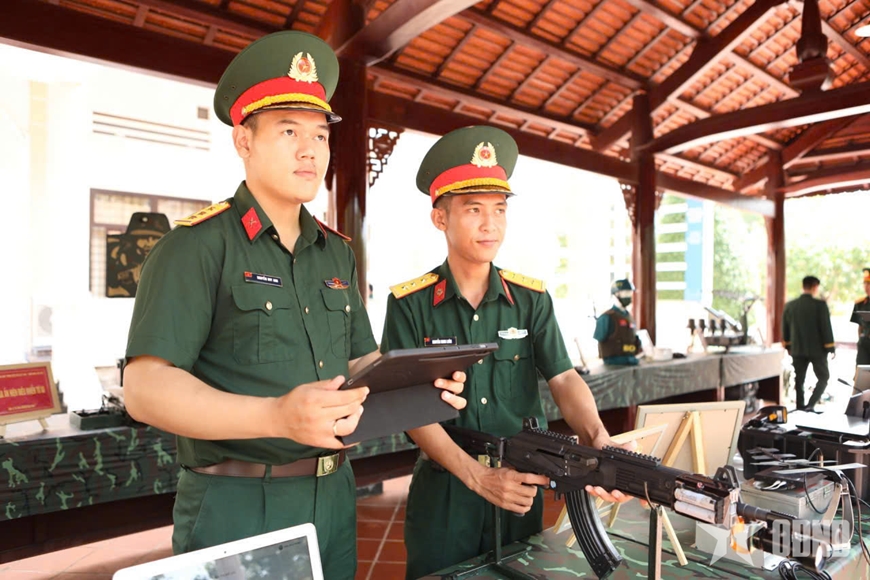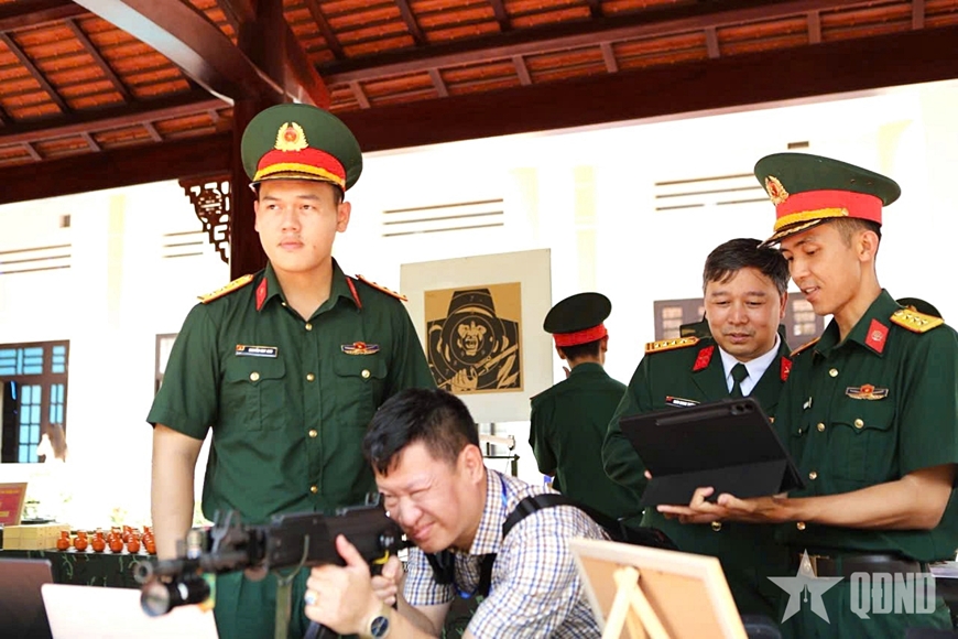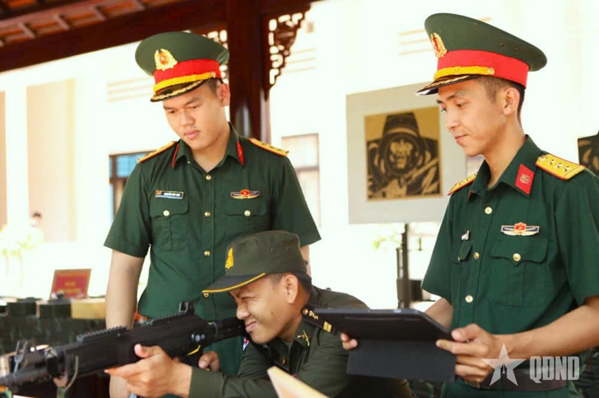 Thượng úy Nguyễn Duy Anh (đứng bên trái) hướng dẫn sĩ quan trẻ Campuchia sử dụng thiết bị tập luyện bắn súng ứng dụng camera AI DA01 tại khu trưng bày sản phẩm huấn luyện của Sư đoàn 5.