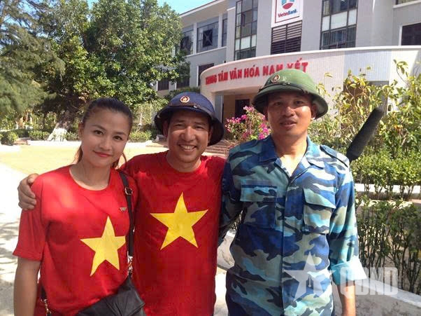 | Kỷ niệm thân tình giữa Thiếu tá Đặng Xuân Kiên và nghệ sĩ Quang Thắng (cùng MC VTV) tại đảo Nam Yết. Ảnh: NVCC |