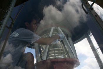 | Bảo quản, vệ sinh đèn biển ở trạm hải đăng đảo Tiên Nữ. |